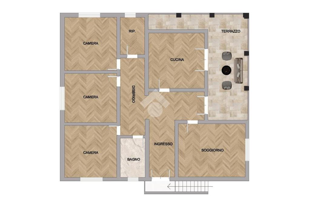 Soggiorno – Cucina – Tre camere – Bagno –Ripostiglio – Posti auto coperti – Terrazzo